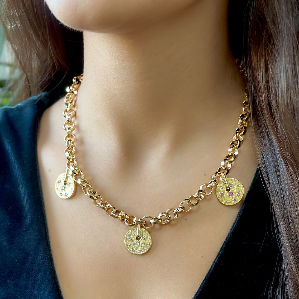 Colier cu zale de dama realizat din metal comun placat cu aur galben de 18 K decorat cu 3 banuti texturati presarat cu pietre cubic zirconia incolore, mov, roz si albastre.