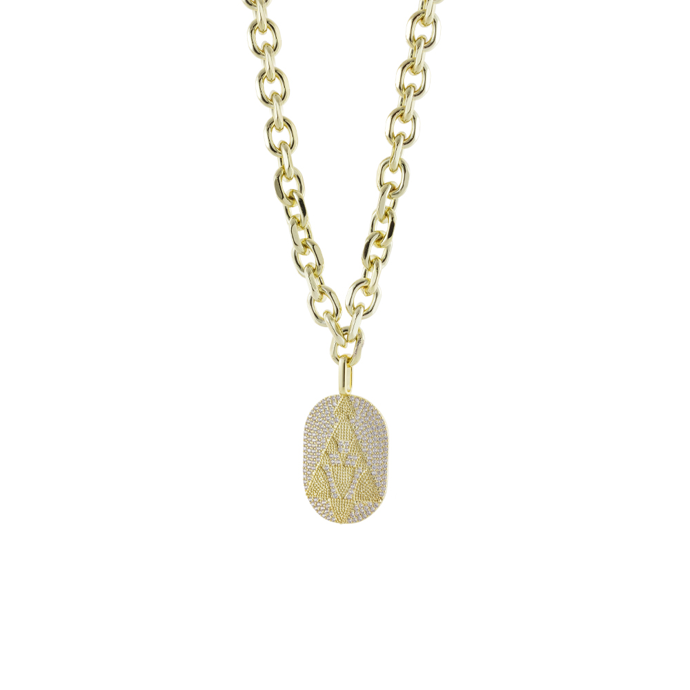 Colier cu zale realizat din metal comun placat cu aur galben de 18K decorat cu pandantiv oval cu model abstract si pietre cubic zirconia incolore.
