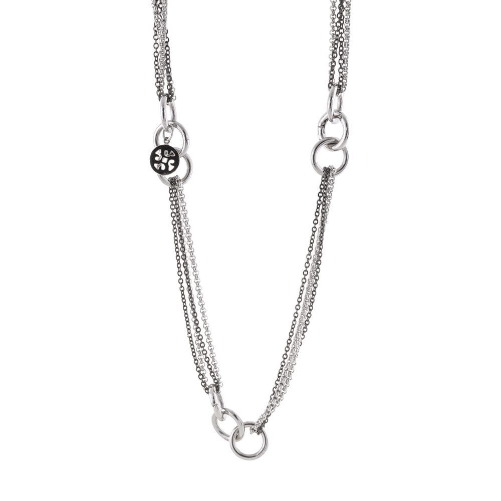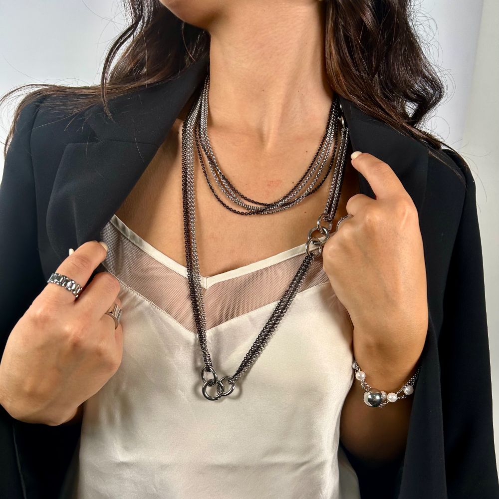 Colier lung, bicolor decorat cu anouri lucioase. Colierul este realizat din otel inoxidabil placat cu rodiu si ruteniu. Recomandari de purtare: