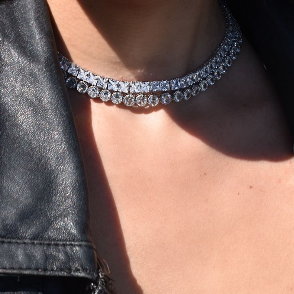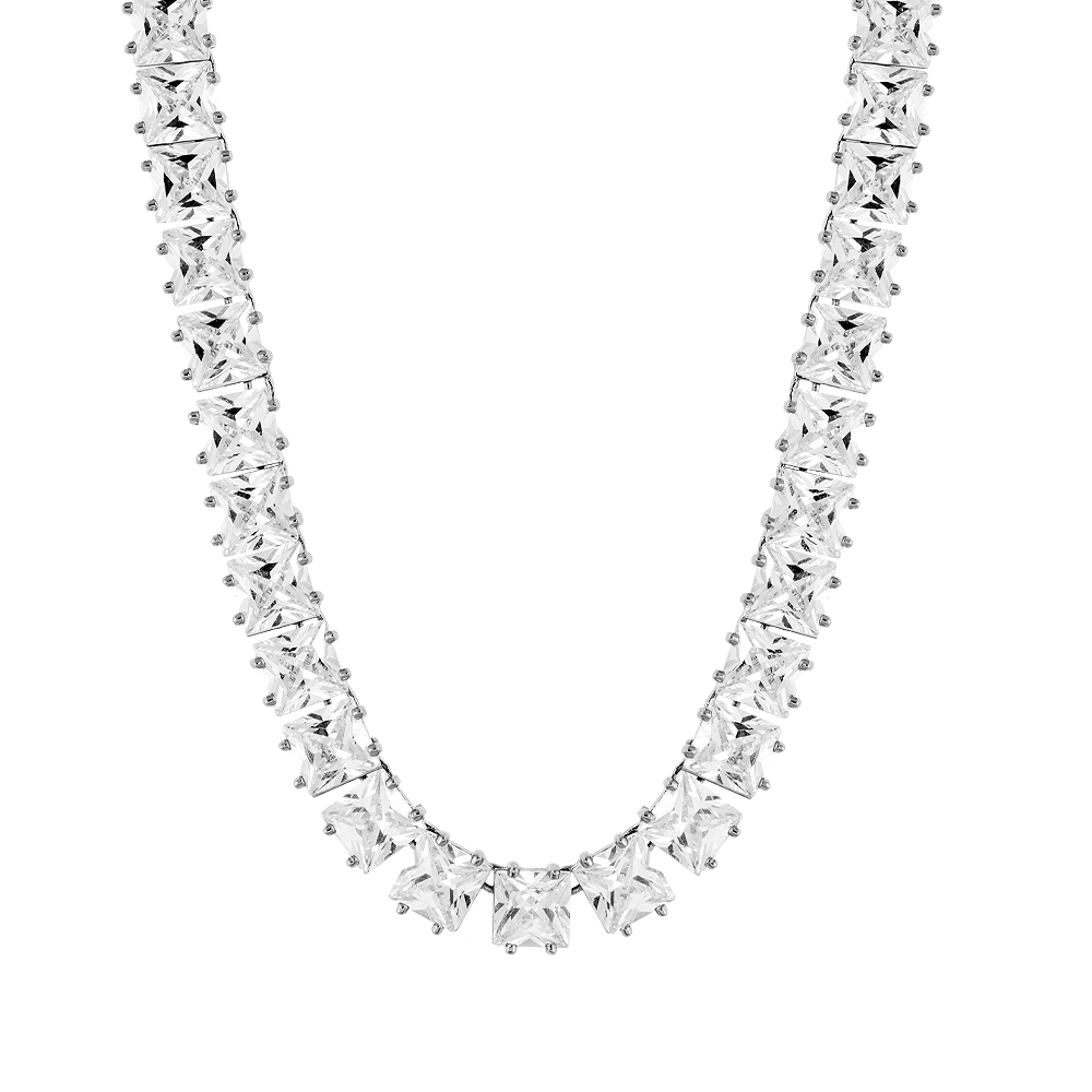 Choker realizat din aliaj placat cu rodiu si decorat cu pietre cubic zirconia incolore, patrate. Recomandari de purtare: