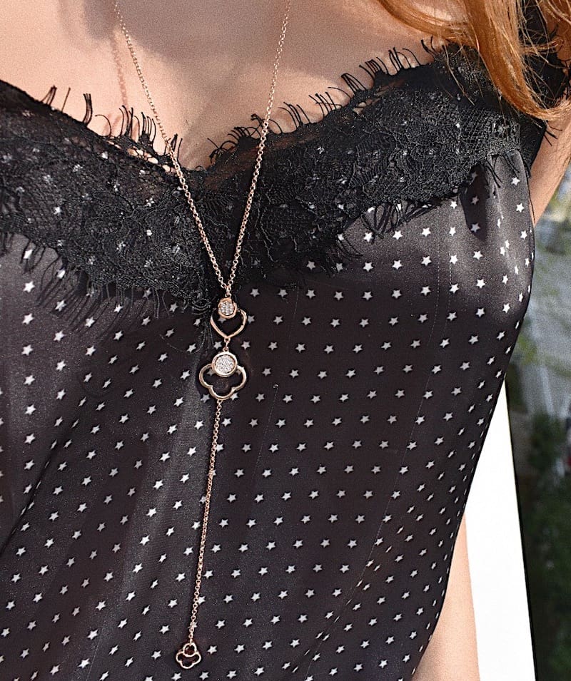 Colier tip “Y” realizat din aliaj in baie de aur roz de 18 K decorat cu pandantive sub forma de inima si floare pe suprafata carora se regasesc pietre cubic zirconia incolore. Recomandari de purtare: