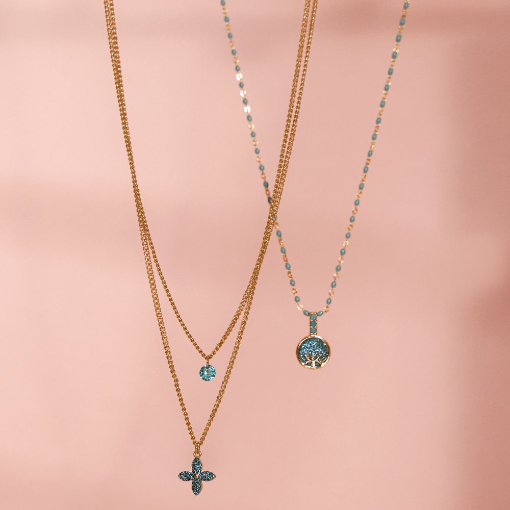 Descrierea produsului Colier cu pandantiv placat cu aur galben de 18 K tip rozariu si glitter turcoaz Princess:
