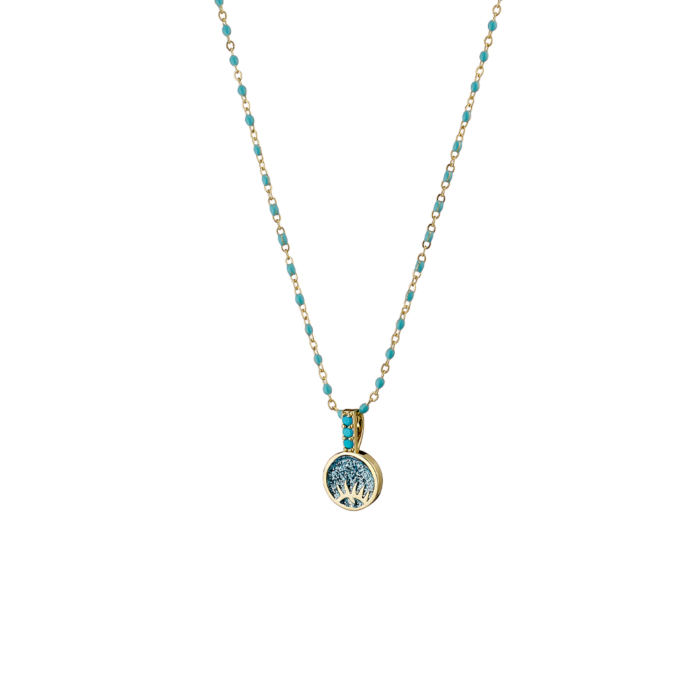 Colier scurt realizat din metal comun placat cu aur galben de 18 K decorat cu rozariu turcoaz si pandantiv rotund in interiorul caruia se regasesc un ochisor si glitter turcoaz.