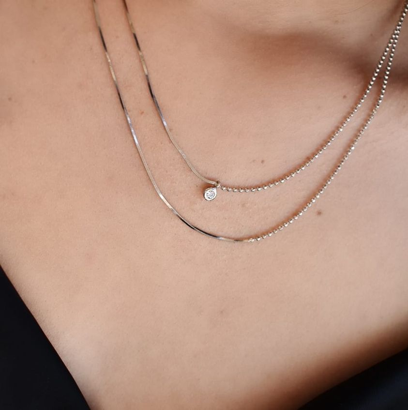 Colier format din doua lanturi de lungimi diferite realizate din argint 925 placat cu rodiu si decorate cu o piatra cubic zirconia incolora si sfere de dimensiuni mici. Recomandari de purtare: