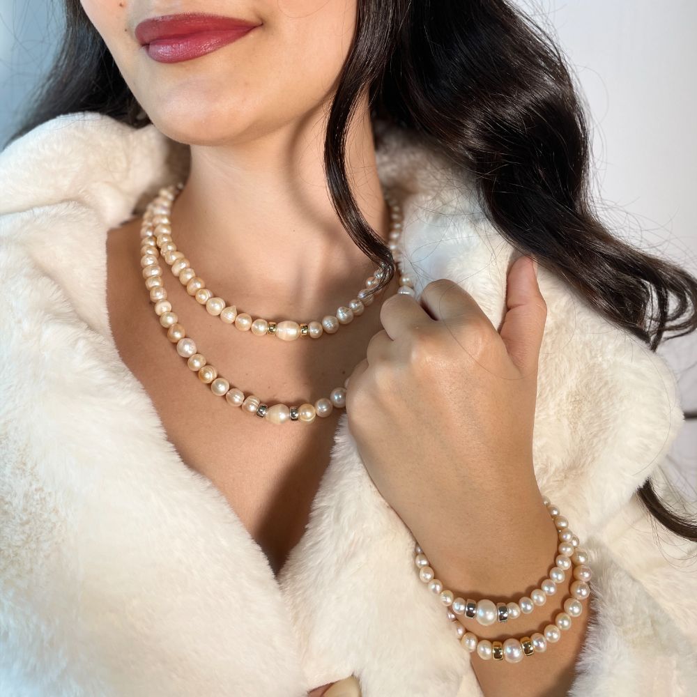 Perlele de cultura confera piesei un farmec clasic si atemporal, in timp ce elemente aurite adauga un accent de lux si eleganta.Poarta-l cu incredere la evenimente speciale sau pentru a adauga un plus de rafinament tinutelor de zi cu zi.