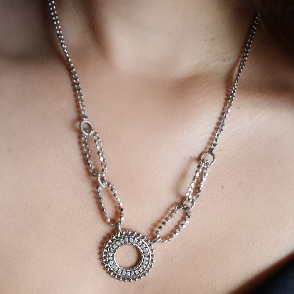 Colier cu zale realizat din argint 925 placat cu rodiu si decorat cu un pandantiv rotund presarat cu pietre cubic zirconia incolore. Recomandari de purtare: