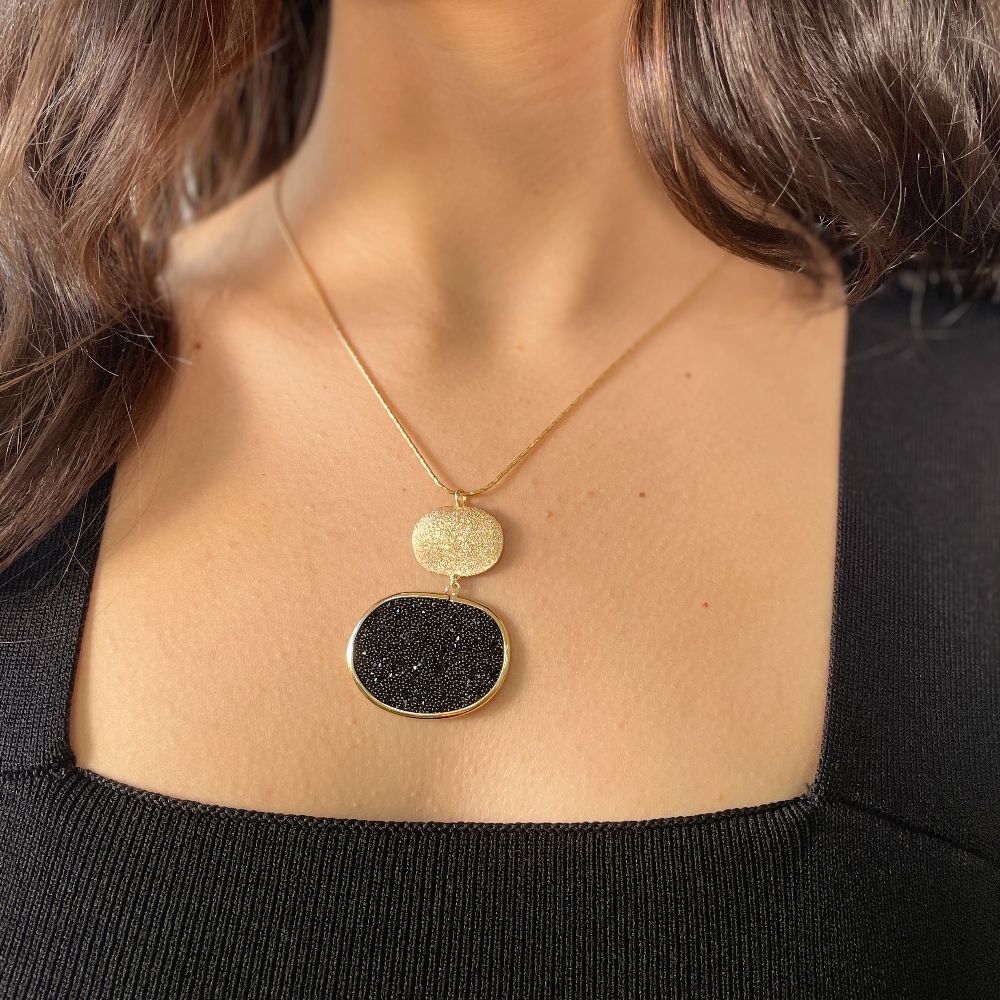 Colier realizat din argint 925 placat cu aur galben de 18K decorat cu 2 pandantive, unul fiind decorat cu cristale caviar negre.