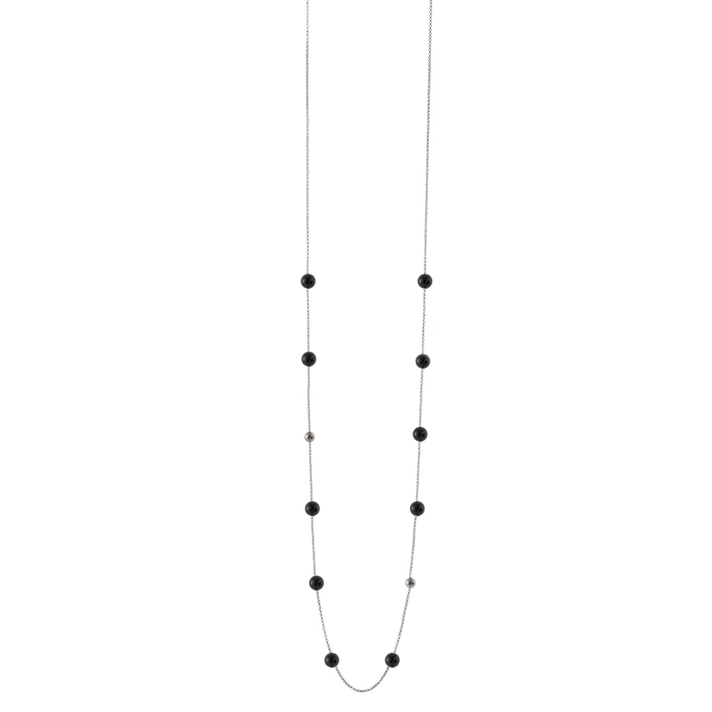 Colier lung realizat din otel inoxidabil placat cu rodiu si decorat din loc in loc cu onix negru si sfere.