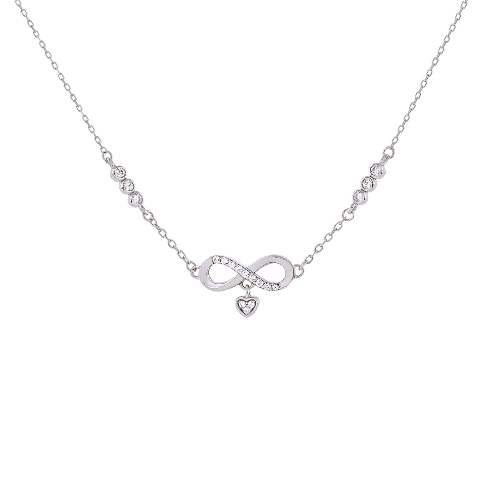 Colier dublu realizat din argint 925 placat cu rodiu si decorat din loc in loc cu pietre cubic incolore si pandantiv infinit. Recomandari de purtare: