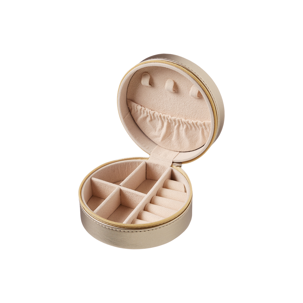 Cutie de bijuterii rotunda realizata din piele ecologica de culoare auriu metalizat cu interior din textil.