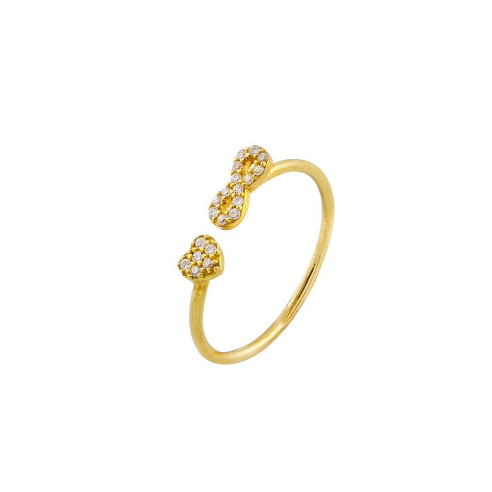 Inel realizat din argint 925 placat cu aur galben de 18 K decorat cu elemente in forma de infinit, inima si cristale naturale de stanca. Un inel comod, perfect pentru purtari zilnice.