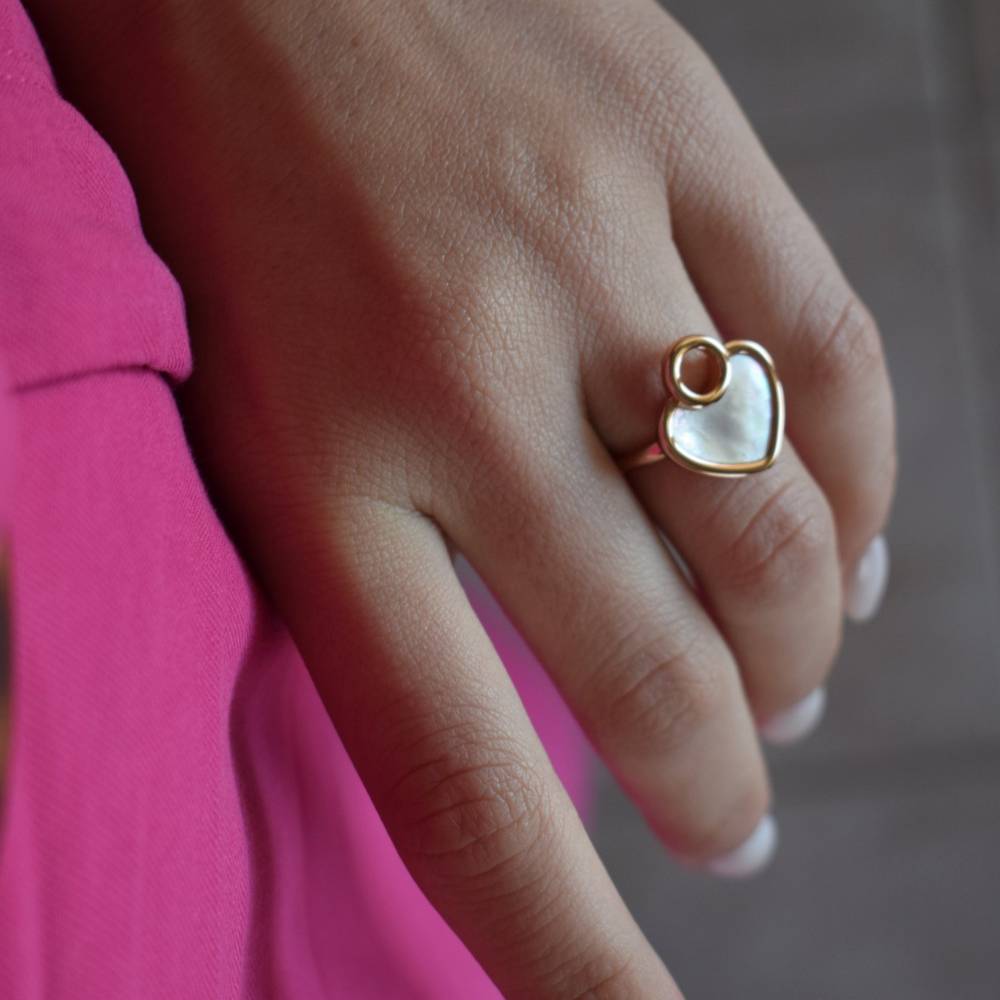 Inel realizat din aliaj in baie de aur roz de 18 K decorat cu un element in forma de inima si sidef. Recomandari de purtare: