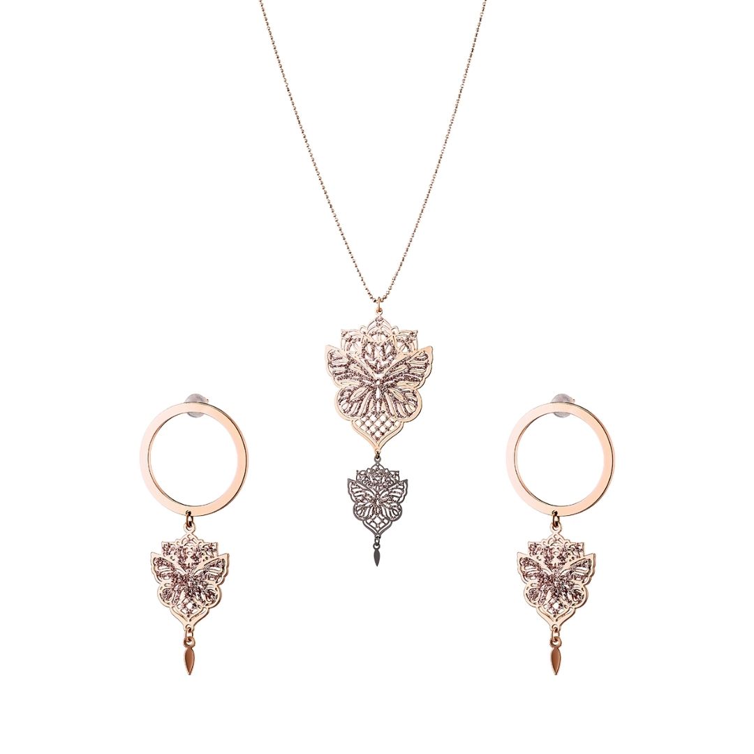 Set colier si cercei din colectia Chakra realizate din aliaj placat cu aur roz de 18 K si ruteniu decorate cu fluturi si particule fine de glitter. Recomandari de purtare: